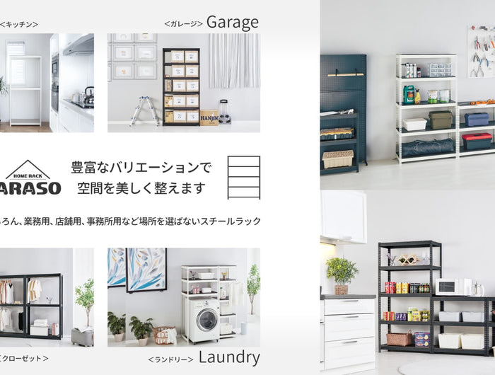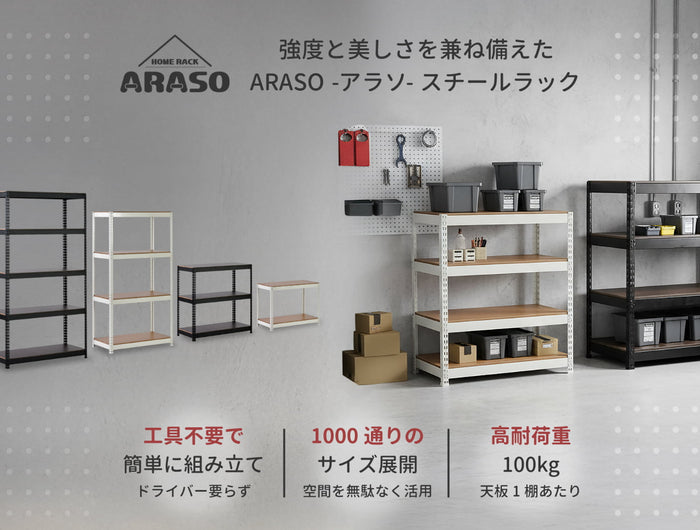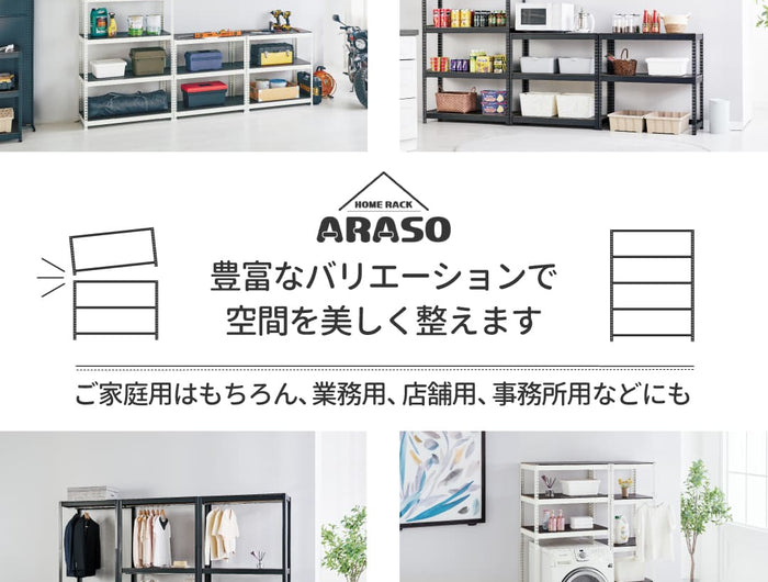ARASO(アラソ)は、家庭用から業務用まで幅広く使えるスチールラック・メタルラック専門店です。 幅・奥行・高さを細かく組み合わせられる豊富なサイズバリエーションを揃えており、 キッチン・リビング・倉庫・ガレージ・店舗など、あらゆるスペースに“ぴったり合う”収納棚を選べます。