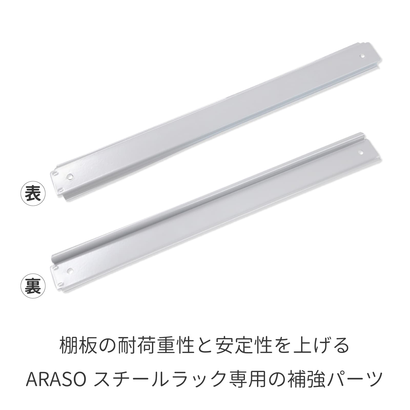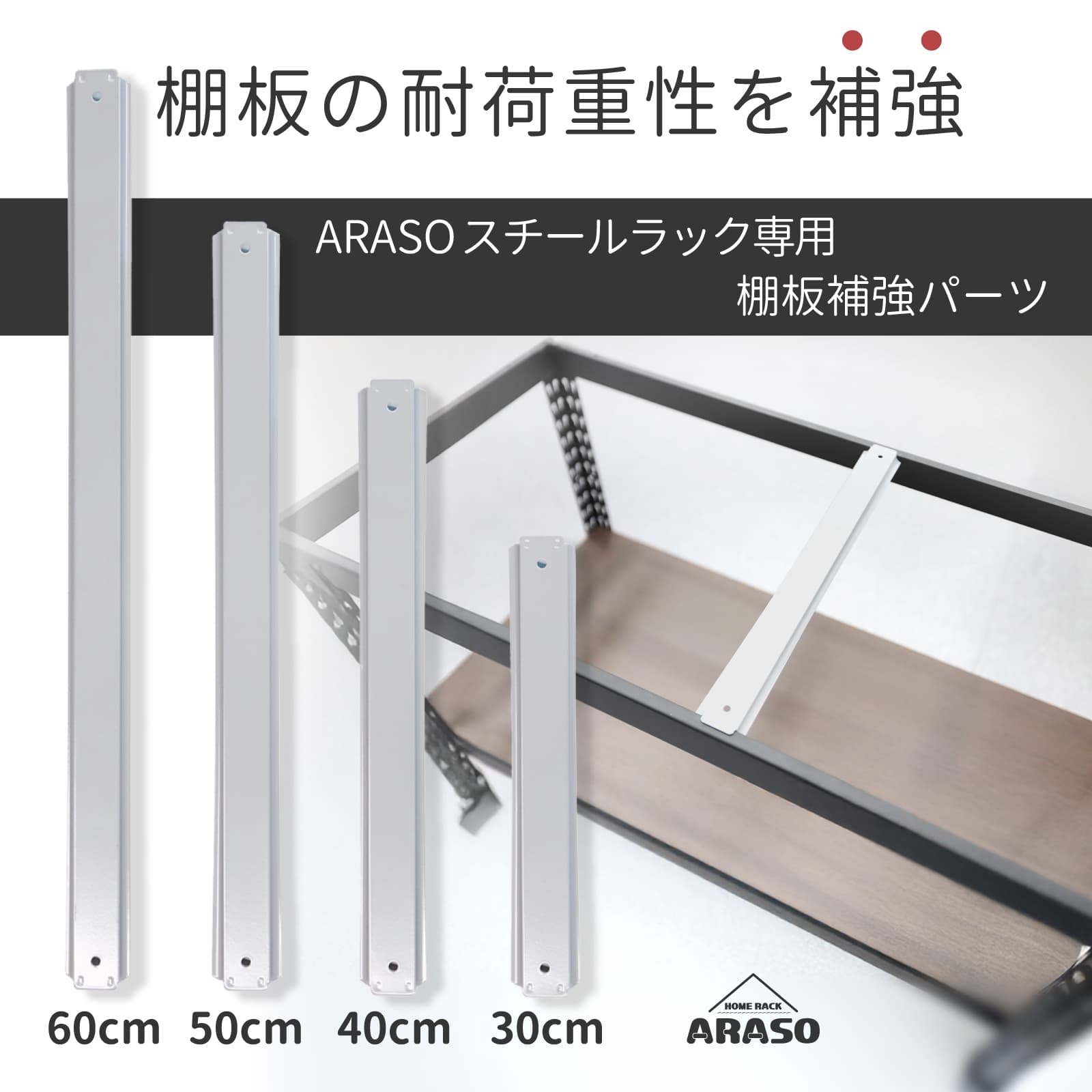 ARASOのスチールラックの奥行、30cm、40cm、50cm、60cmに合わせた4サイズをご用意しております。基本的には幅110cmと120cm用となっておりますが、棚の耐荷重の補強パーツとして、どんな幅の棚板にもご使用いただけます。