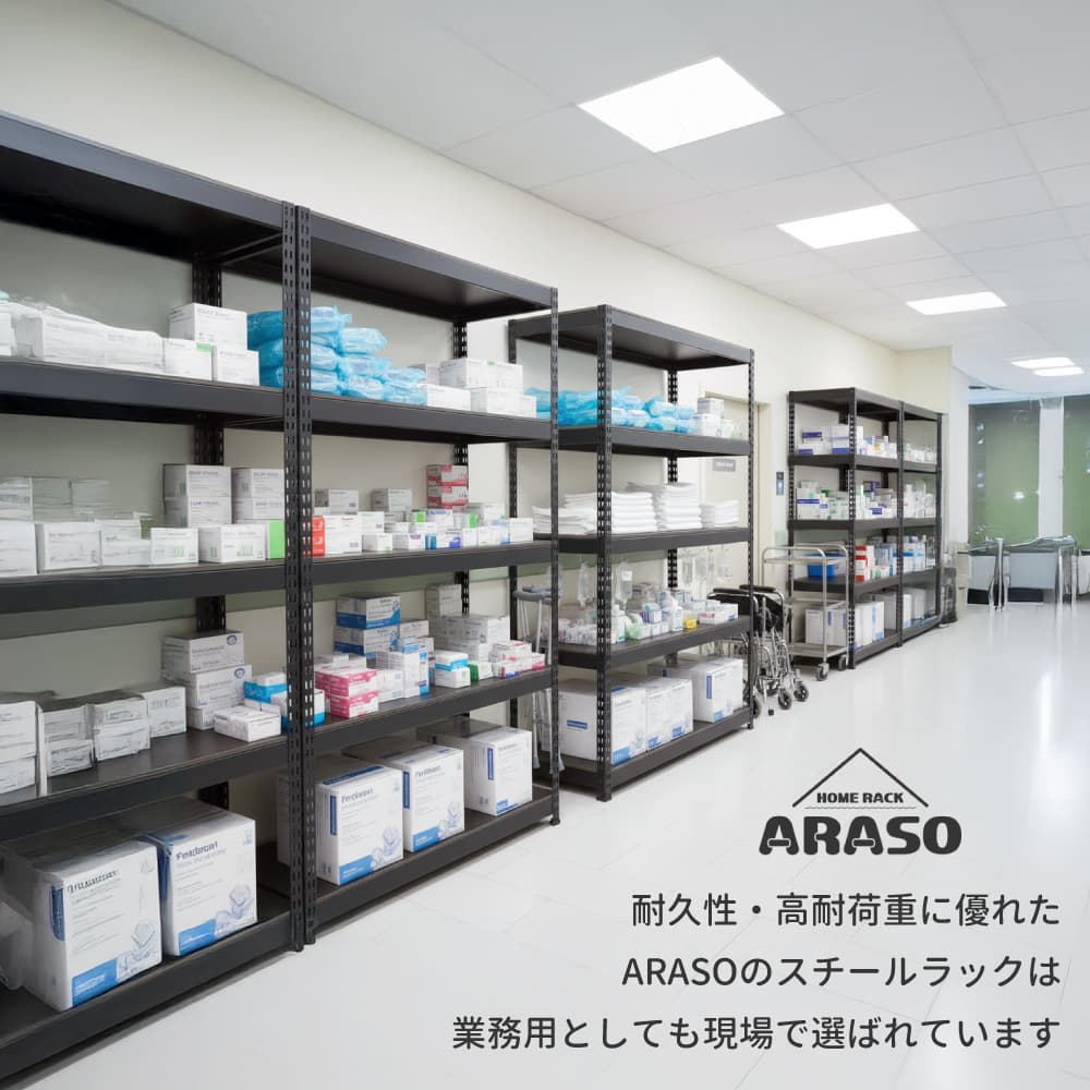 ARASOのラックは1段ごとの耐荷重が高く、棚板がたわんだり、ぐらついたりしにくいため、長期間・高頻度の使用でも安定した収納が可能です。