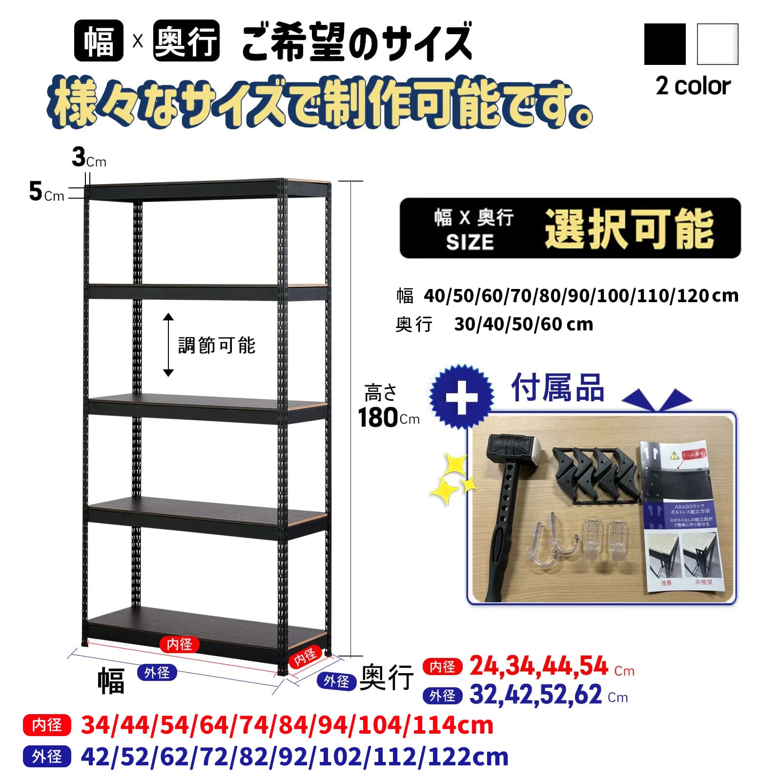 (5段 × 幅 × 奥行(選択可能)× 高さ180)