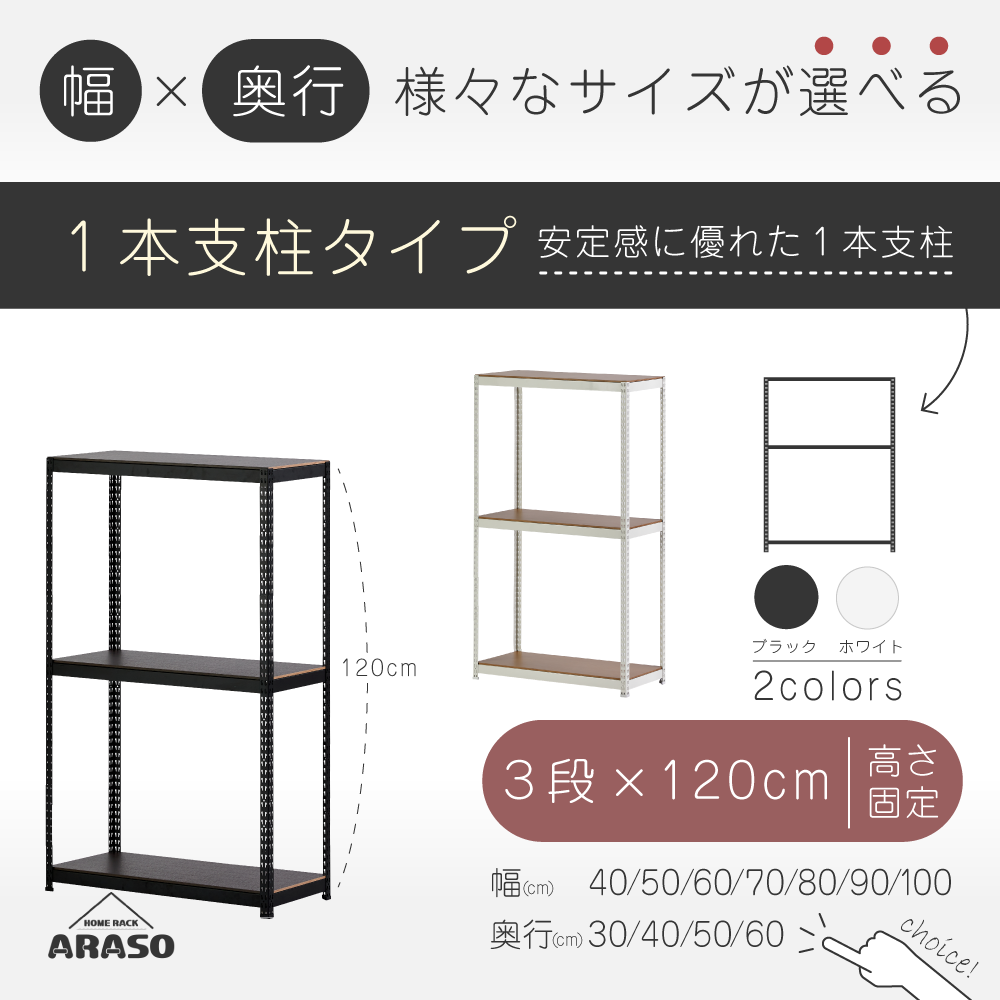 ARASO スチールラック 3段 高さ120 cm 1本支柱タイプ|幅・奥行が選べる|家庭用・店舗・倉庫向けの頑丈ラック|送料無料